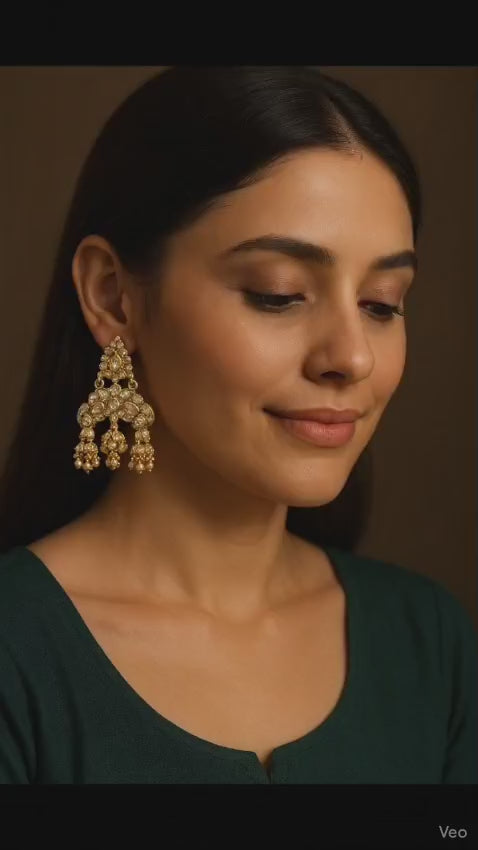 Designed to offer a royal statement look, the earrings combine Kundan work, chandbali shape, and triple jhumka danglers, making them eye-catching yet comfortable for long wear. Pair them with lehengas, sarees, gowns, shararas, and Anarkali suits.