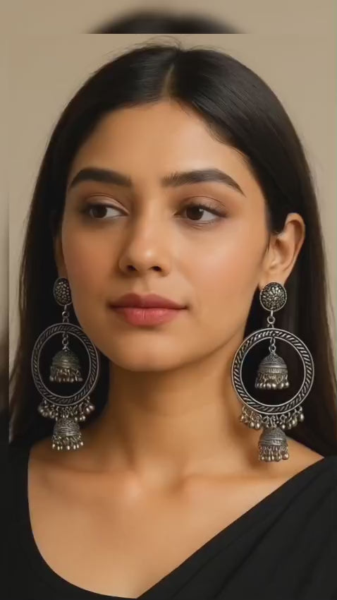 Royal Oxidized Double Jhumka Hoop Earrings – Traditional Ethnic Statement Jewelry for Women