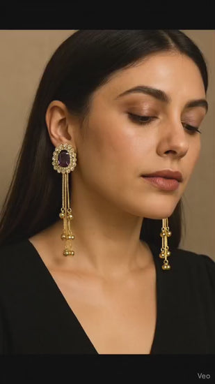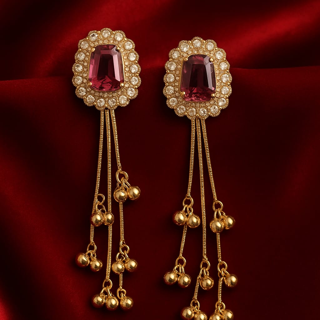 These premium earrings feature a vibrant ruby-pink centerpiece stone, surrounded by shimmering CZ diamonds, giving a luxurious Kundan-inspired finish. The elegant long chain danglers with mini gold beads add graceful movement—perfect for weddings, festivals, parties, and ethnic celebrations.