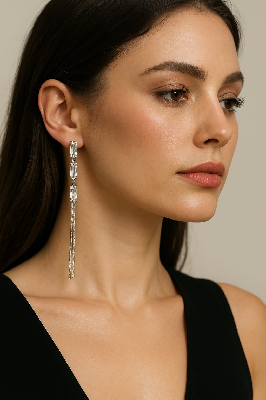 These stunning earrings feature a vertical arrangement of premium rectangular crystals that catch the light beautifully, leading into delicate long chain danglers that create a graceful movement. Their minimalist yet classy design makes them perfect for parties, weddings, festive nights, cocktails, or stylish evening outings.